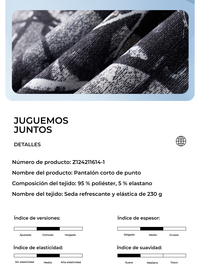 - Composición: 95 % poliéster, 5 % elastano
