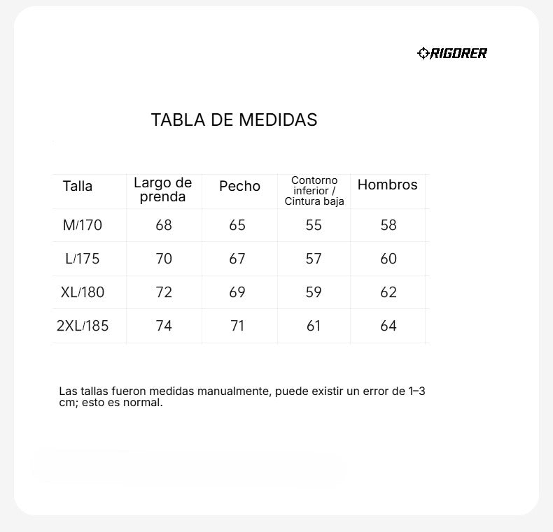 - Logotipo circular distintivo de RIGORER en el pecho.