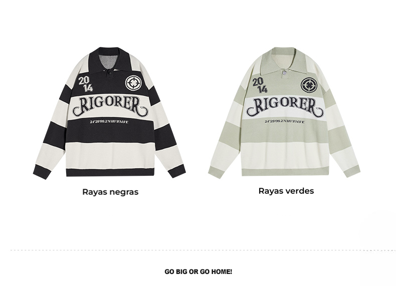- Estilo retro “College 90’s” con franjas horizontales de gran tamaño.