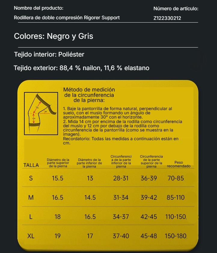Materiales Tejido interior: Poliéster Tejido exterior: 88,4% nailon, 11,6% elastano Características principales Compresión doble: Aporta mayor estabilidad y soporte a... Leer más...