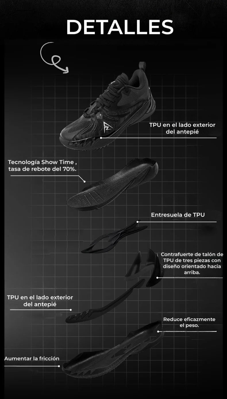 Talón reforzado: Tres piezas de TPU elevadas para máxima sujeción del tobillo y reducción del impacto.