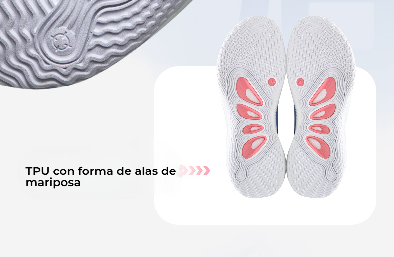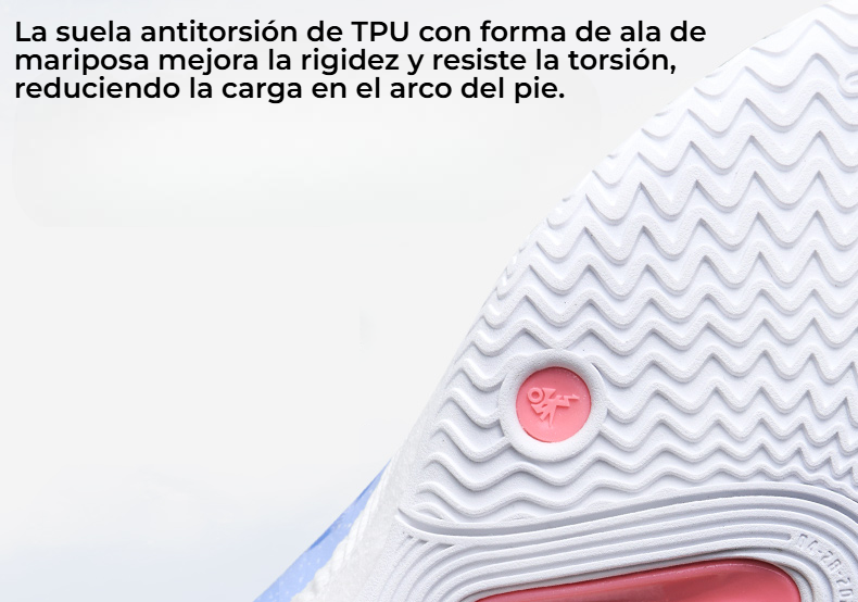 Suela antitorsión de TPU con forma de alas de mariposa: Aumenta la rigidez estructural y resiste la torsión, reduciendo la carga sobre el arco del pie y mejorando la estabilidad.