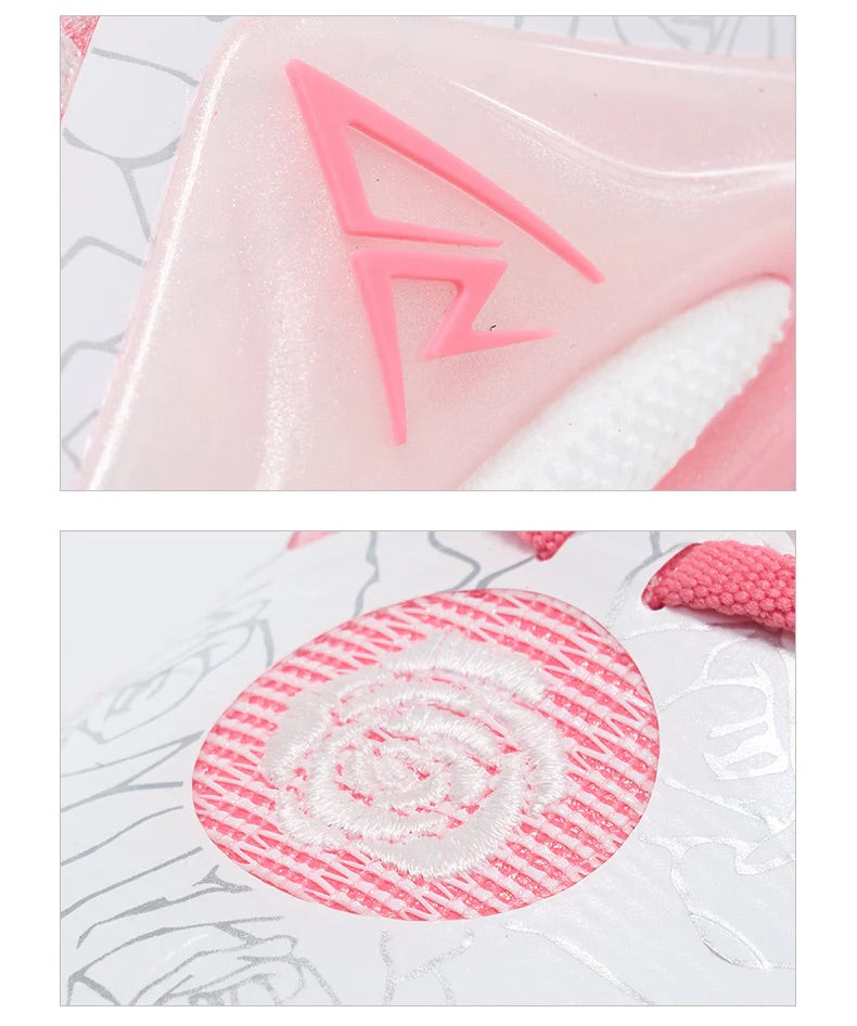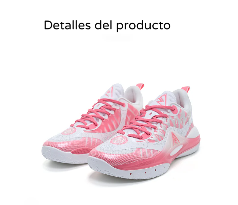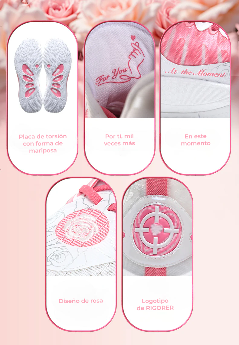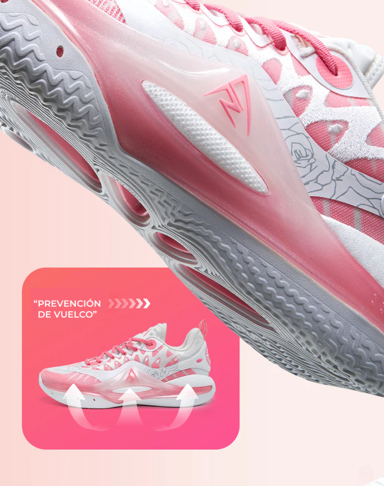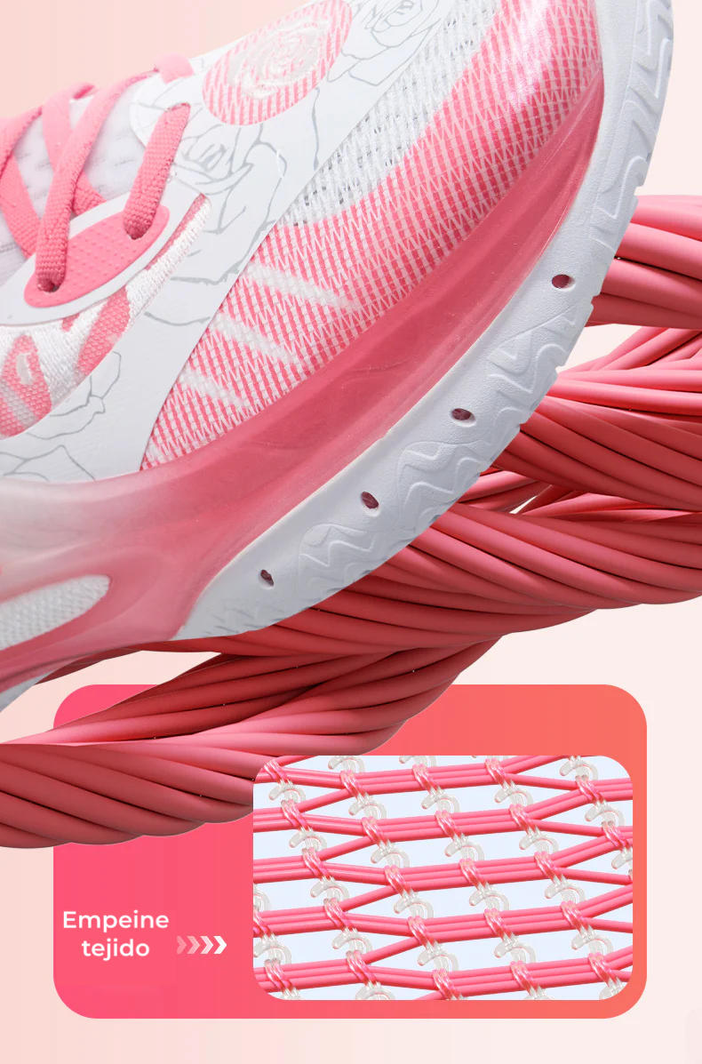 Inspiradas en la delicadeza de las rosas y la ligereza de las mariposas, estas zapatillas fusionan tecnología avanzada con una estética única en tonos rosado pastel y blanco perla, ideales para destacar dentro y fuera de la cancha.