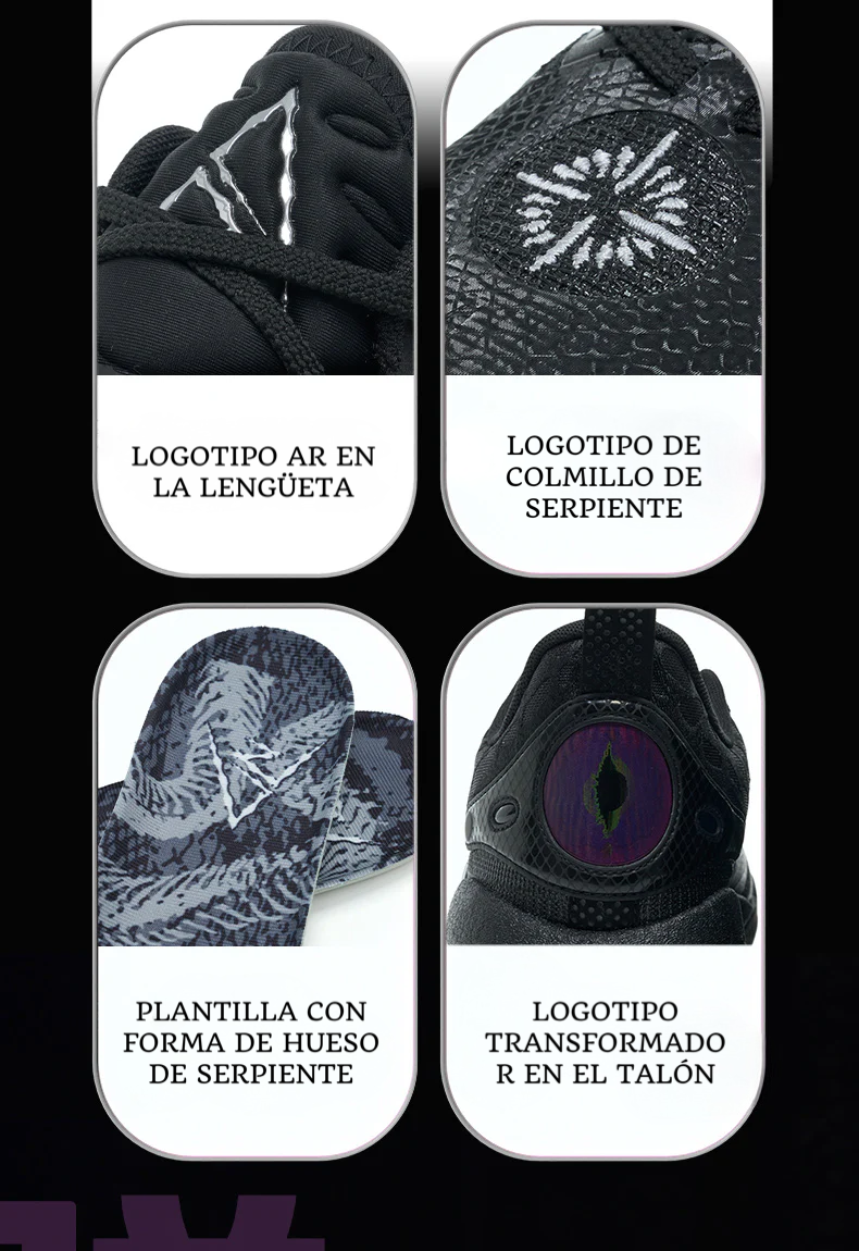 Las AR2 ‘Snake Eyes’ combinan diseño agresivo, alto rendimiento y detalles inspirados en la fuerza y agilidad de la serpiente. Con una estética totalmente en negro y detalles únicos, son ideales para jugadores que buscan potencia, seguridad y estilo en la cancha.